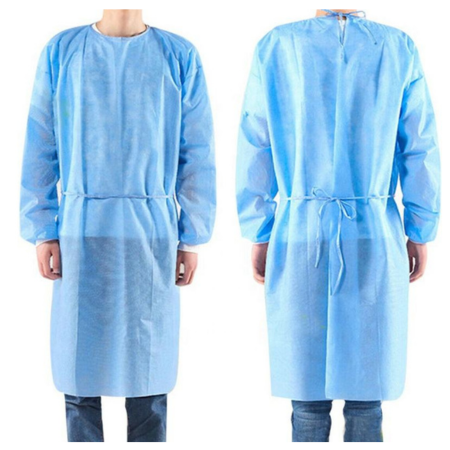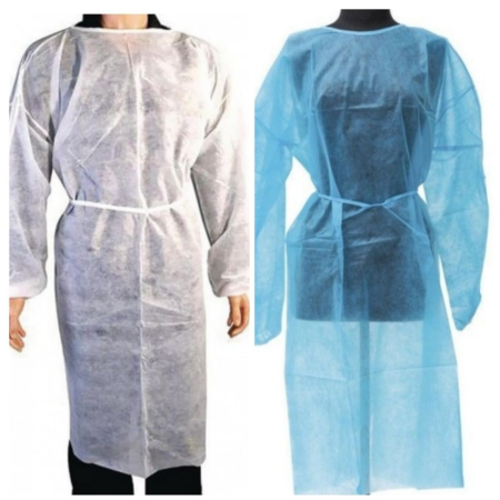 Disposable gown made of non-woven fabric, 100% opaque polypropylene with excellent resistance, water-repellent, absorbent, ventilated, and soft, odorless, non-sterile.